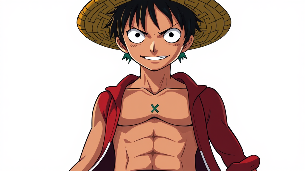 Monkey D. Luffy, from One Piece anime, showcasing an X-shaped scar on his chest and his iconic Straw Hat; features a symmetrical body in a portrait style with cinematic lighting and high contrast; character concept art in 8K resolution with a dynamic and heroic pose, incorporating subtle creative elements to reflect his adventurous spirit and determination, in an artstation-inspired design capturing his vibrant personality and unwavering resolve.