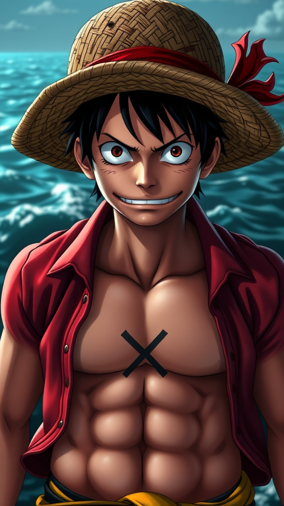 Monkey D. Luffy from One Piece, featuring an X-shaped scar on his chest and wearing his iconic Straw Hat. The portrait showcases a symmetrical body with dynamic, cinematic lighting and high contrast. The scene is inspired by character concept art, rendered in ultra-high definition with an 8K resolution, highlighting intricate details and vivid colors. Luffy's expression is determined and adventurous, capturing his essence as a pirate leader. The background subtly reflects the vastness of the ocean, enhancing the adventurous theme inherent to Luffy's story.