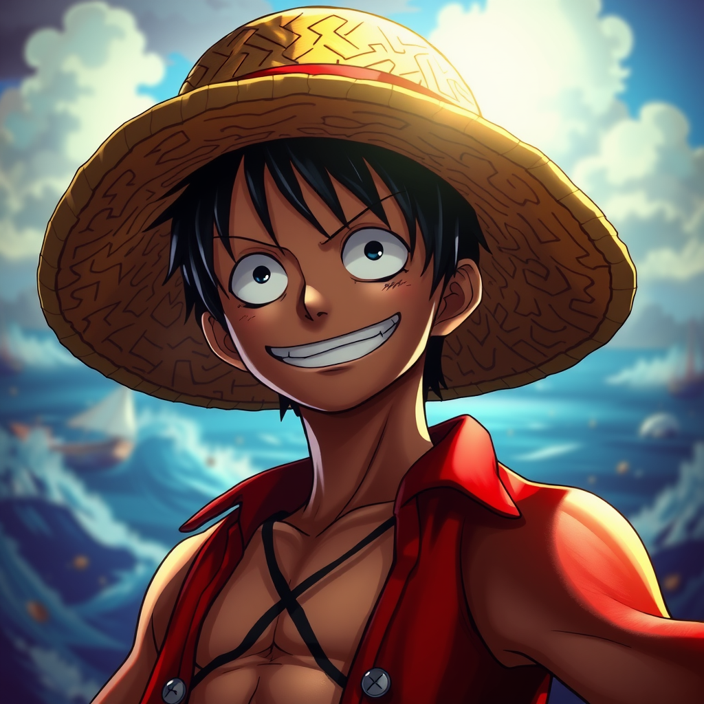 Monkey D. Luffy from the One Piece anime, featuring an X-shaped scar prominently displayed on his chest and wearing his iconic Straw Hat, depicted with a perfectly symmetrical and muscular body. The portrait is rendered with dramatic cinematic lighting and high contrast, capturing the essence of his adventurous spirit. The artwork, akin to a character concept from ArtStation, is presented in exquisite 8K detail, where dynamic energy and a hint of mischief radiate from his eyes and confident smile against a vibrant, sea-faring backdrop.