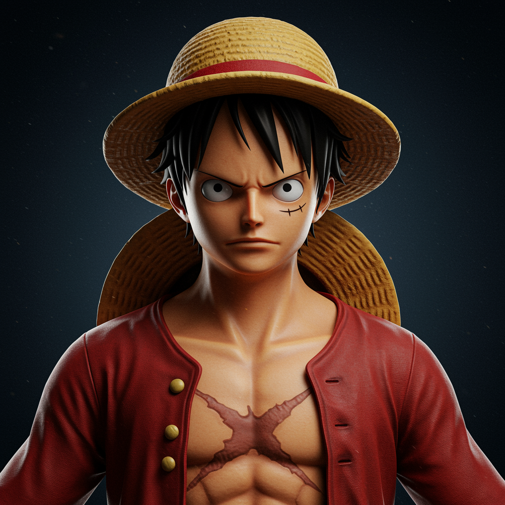 Monkey D. Luffy, from the One Piece anime, featuring his iconic Straw Hat and distinguished X-shaped scar on his chest. Capture his symmetrical physique in a portrait with cinematic lighting and high contrast, achieving a sense of depth and intensity. The composition should evoke the feel of character concept art, worthy of an ArtStation showcase, rendered in stunning 8K resolution. Subtle creative touches reflect his adventurous spirit and fearless determination, encapsulating the essence of a legendary pirate in a dynamic and engaging visual narrative.
