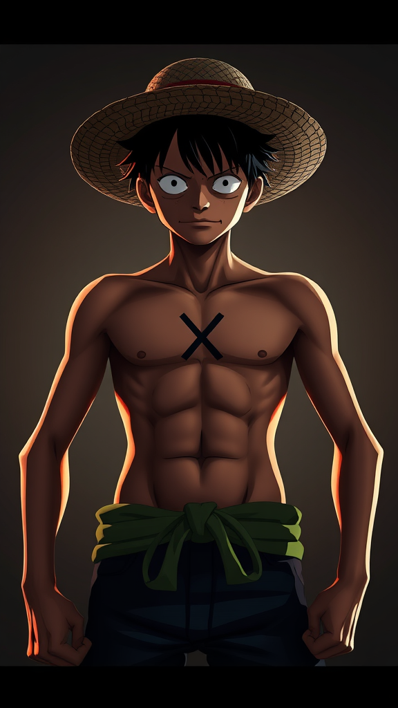 Monkey D. Luffy from the One Piece anime stands confidently, displaying the distinctive X-shaped scar on his chest. Adorned with his iconic Straw Hat, Luffy's symmetrical physique is accentuated under cinematic lighting, casting dramatic shadows that highlight his determined expression. Rendered in high contrast and vivid detail, this character concept art captures the essence of Luffy in an 8K resolution, evocative of a masterful ArtStation piece. Subtle creative touches enhance the portrayal, emphasizing his adventurous spirit and unwavering resolve.