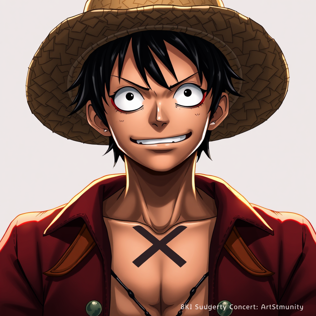 Monkey D. Luffy in an epic character concept art style, featuring an X-shaped scar prominently displayed on his chest, wearing his iconic straw hat. The portrait captures his symmetrical features with cinematic lighting and high contrast, rendered in stunning 8K resolution, inspired by the dynamic energy of the One Piece anime. The artwork emanates a sense of adventure and determination, with subtle creative additions that enhance Luffy's charismatic persona, suitable for ArtStation's vibrant artistic community.