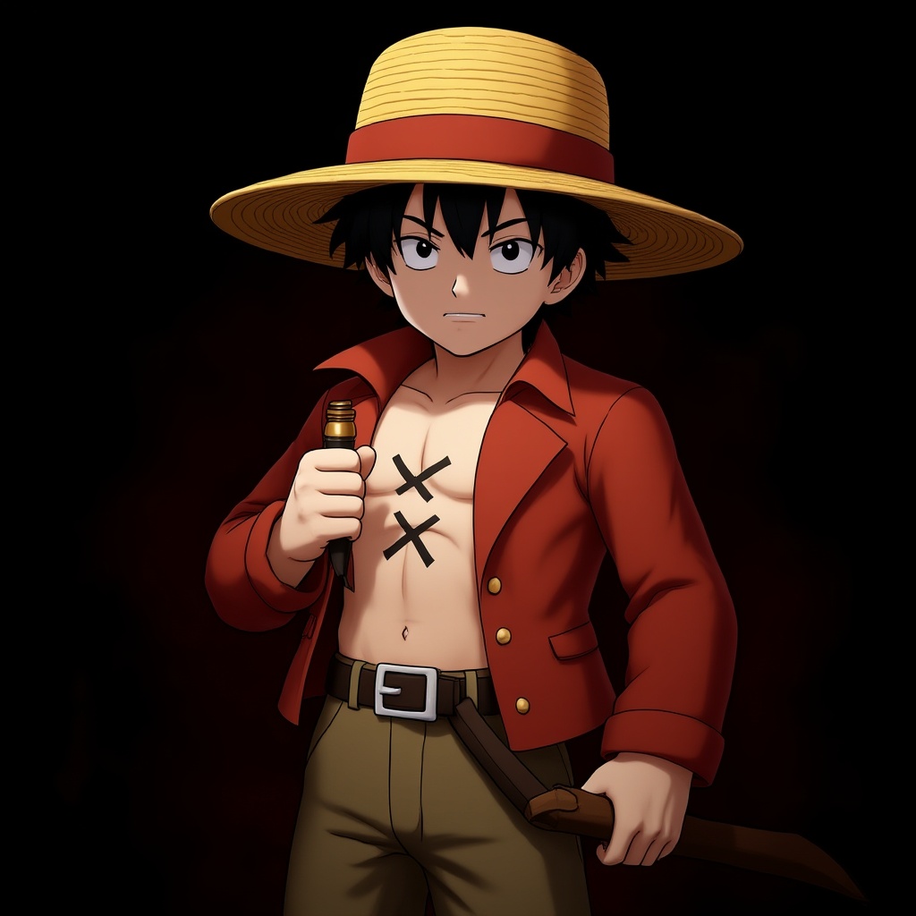 View this AI-generated image featuring monkey d luffy from one piece anime featuring an iconic x shaped scar on his chest wearing his signature straw hat depicted with a symmetrical and well defined physique set in a high contrast cinematic lighting environment capturing the essence of adventure and