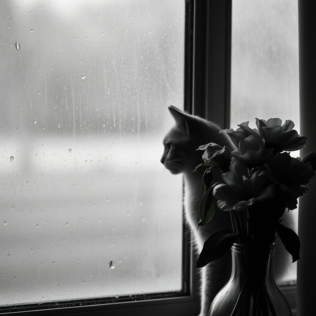 Monochromatic hyper-realism black and white image capturing the somber mood of a rainstorm; a solitary cat gazes through a fogged window, embodying a deep sense of sadness. Next to it, a flower vase holds wilted flowers, their petals drooping delicately, as raindrops cascade down the glass. Shot with a Nikon Z7, equipped with a Nikkor Z 105mm f/2.8 S lens, the scene is framed in a 16:9 aspect ratio, lending an elongated perspective to the somber ambiance.