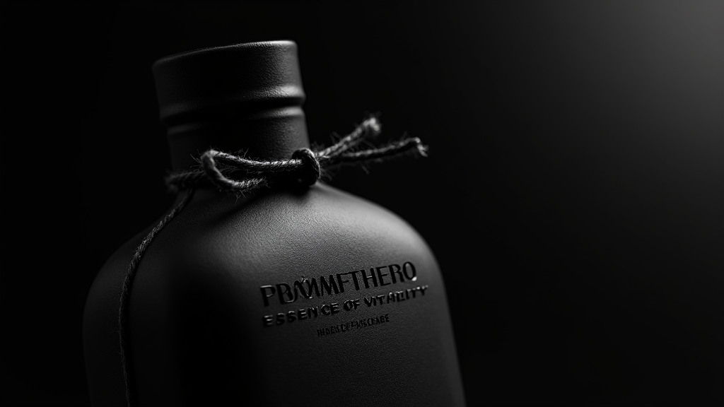 A striking, monochromatic image captures a close-up of a matte black bottle, featuring elegantly embossed text: "PROMPTHERO – ESSENCE OF VITALITY – 50 ML – HANDLE WITH CARE." Dramatic lighting creates subtle highlights and rich shadows that dance across the bottle's leather-like texture. A dark twine is wrapped snugly around the neck, imparting a touch of rugged sophistication. On the right, the image seamlessly transitions into a smooth gradient, enhancing its sleek, contemporary, editorial appeal.