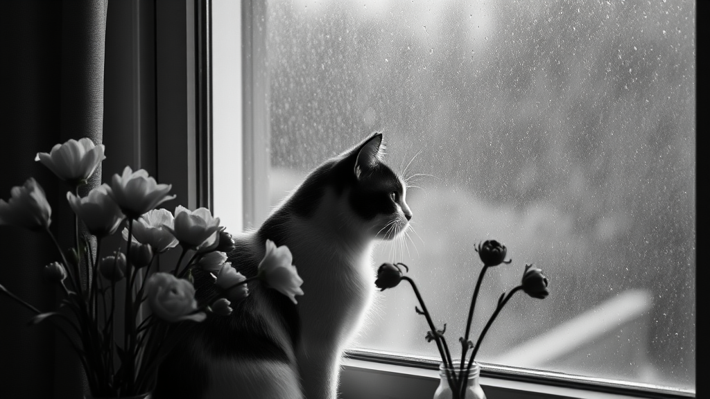 monochromatic rainstorm hyper-realism black and white cat gazing through window evoking sadness alongside wilted flowers in a vase captured with a Nikon Z7 Nikkor Z 105mm f/2.8 S lens scene evokes still melancholy ambiance mood punctuating the silence of the room