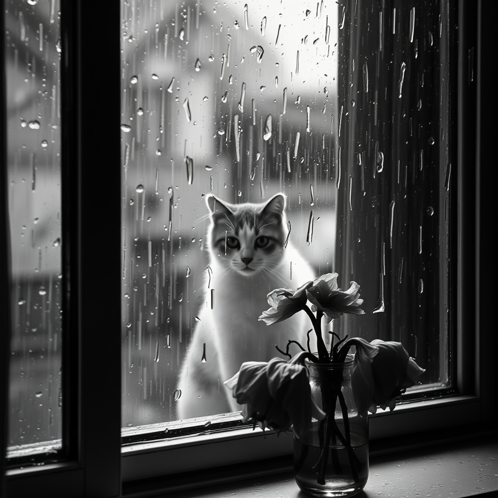 Monochromatic rainstorm scene captured in hyper-realistic detail, portraying a somber black and white ambiance. A solitary cat peers through a rain-specked window, its eyes reflecting a profound sadness. Inside, resting on the sill, a vase holds wilted flowers, their petals drooping as if mirroring the melancholic mood. The image, taken with a Nikon Z7 and Nikkor Z 105mm f/2.8 S lens, captures the intricate play of light and shadow during the rain, emphasizing textures and emotions, with the scene framed in a cinematic 16:9 aspect ratio.