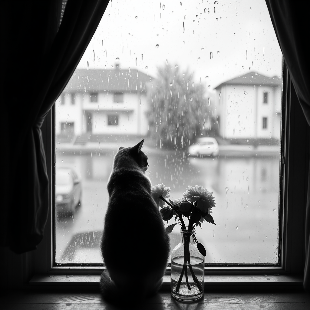 Monochromatic scene capturing the melancholy of a rainstorm in hyper-realism, viewed in black and white through a window. A solitary cat gazes outside, embodying a deep feeling of sadness. A flower vase sits on the sill, holding wilted flowers that mirror the mood. The image, shot with a Nikon Z7 and Nikkor Z 105mm f/2.8 S lens, beautifully contrasts the starkness of the rain-drenched world outside.
