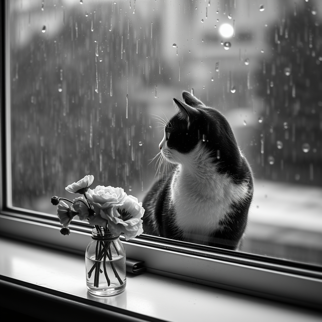 Monochromatic scene of a rainstorm captured in hyper-realism, featuring a black and white cat gazing through a window with an air of melancholy. A delicate flower vase sits on the windowsill, holding wilted flowers that emphasize the somber mood. Shot with a Nikon Z7 and Nikkor Z 105mm f/2.8 S lens, the scene explores the profound emotion of sadness in a 16:9 aspect ratio.