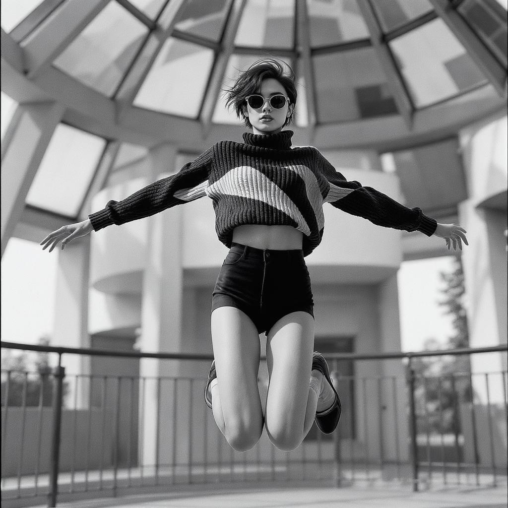 Monochrome high fashion black and white upper body photo featuring a slender, flat-chested young Asian female supermodel with short tousled black hair, wearing a tubular sleeve color theory sweater. Her midriff is exposed above modernist high-waisted shorts, accessorized with round sunglasses. The supermodel is captured mid-jump, arms spread wide, aligned with the rule of thirds. The backdrop reveals a constructivist-style observatory, illuminated by primary color light streaming through colored glass. The scene is bathed in soft natural lighting with an Ilford HP5 aesthetic, emphasizing contrast, tone, and texture. The image maintains a detailed yet vibrant quality, with intentional noisiness and a touch of blur for an artistic effect.
