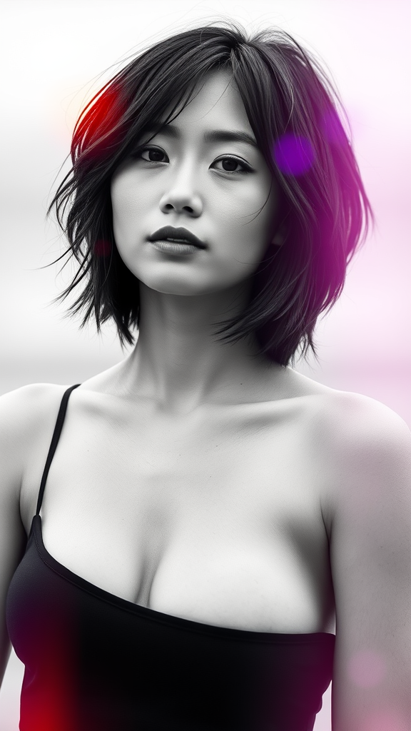 Monochrome high fashion image of a 24-year-old Asian female yoga instructor, featuring radiant porcelain skin that's smooth yet easily flushed, especially in the cold or wind. She appears natural with no makeup, showcasing skin pores and texture in sharp focus. Her toned triceps show a gentle, defined contour, and she has a petite chest. Her choppy bob haircut with tousled layers adds character. The atmosphere is colorful and vibrant with an artistic touch of noise and blur, creating an ethereal, slightly abstract effect.