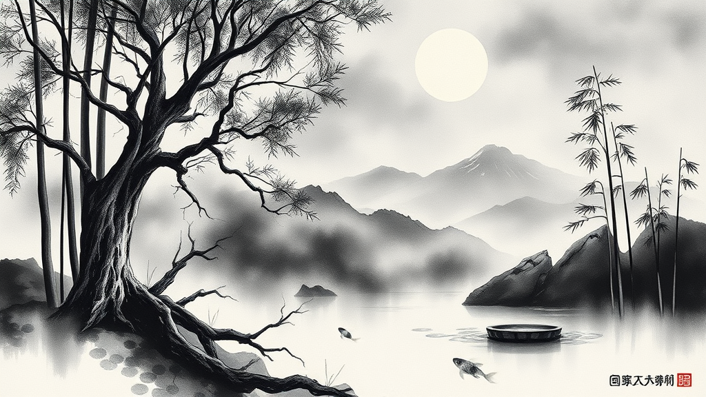 Monochrome ink landscape, wisps of mist curling around ancient gnarled trees, slender bamboo stretching upwards, serene koi pond reflecting moonlight, ethereal mountain peaks in the distance, delicately rendered with soft brushstrokes, capturing a tranquil moment in nature, infused with a sense of timelessness and subtle elegance.
