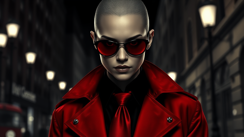 Monochrome photograph, female vampire from Clan Tremere, captivating face, bald, dressed in a chic crimson trench coat over a buttoned black shirt with a matching red tie, sporting sunglasses with amber lenses, set against a nighttime urban backdrop illuminated by streetlights, embodying the essence of Vampire: The Masquerade. Her face is detailed and symmetrical, with real, lifelike skin textures. The scene is photorealistic, emphasizing hyper-realism and intricate details reminiscent of film noir, with visible skin pores and matte texture. The lighting is soft, featuring subsurface scattering, and the atmosphere is enriched with heavy shadows, achieving a masterpiece quality, adhering to the golden ratio. Shot in film photography style, the image is crisp with a subtle soft focus, avoiding any elements like logos, watermarks, blur, cartoonish aspects, or poorly drawn figures, ensuring a seamless composition within the frame.