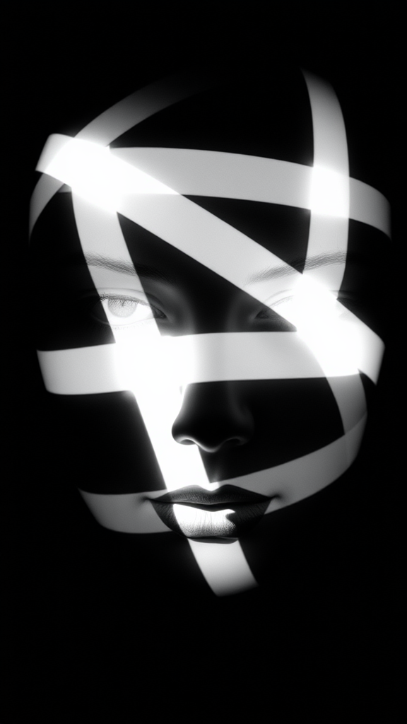 Monochrome photograph of a face composed of intersecting light stripes, with a focus on minimalistic and graphic design elements, capturing a sophisticated play between shadows and illumination against a dark backdrop.