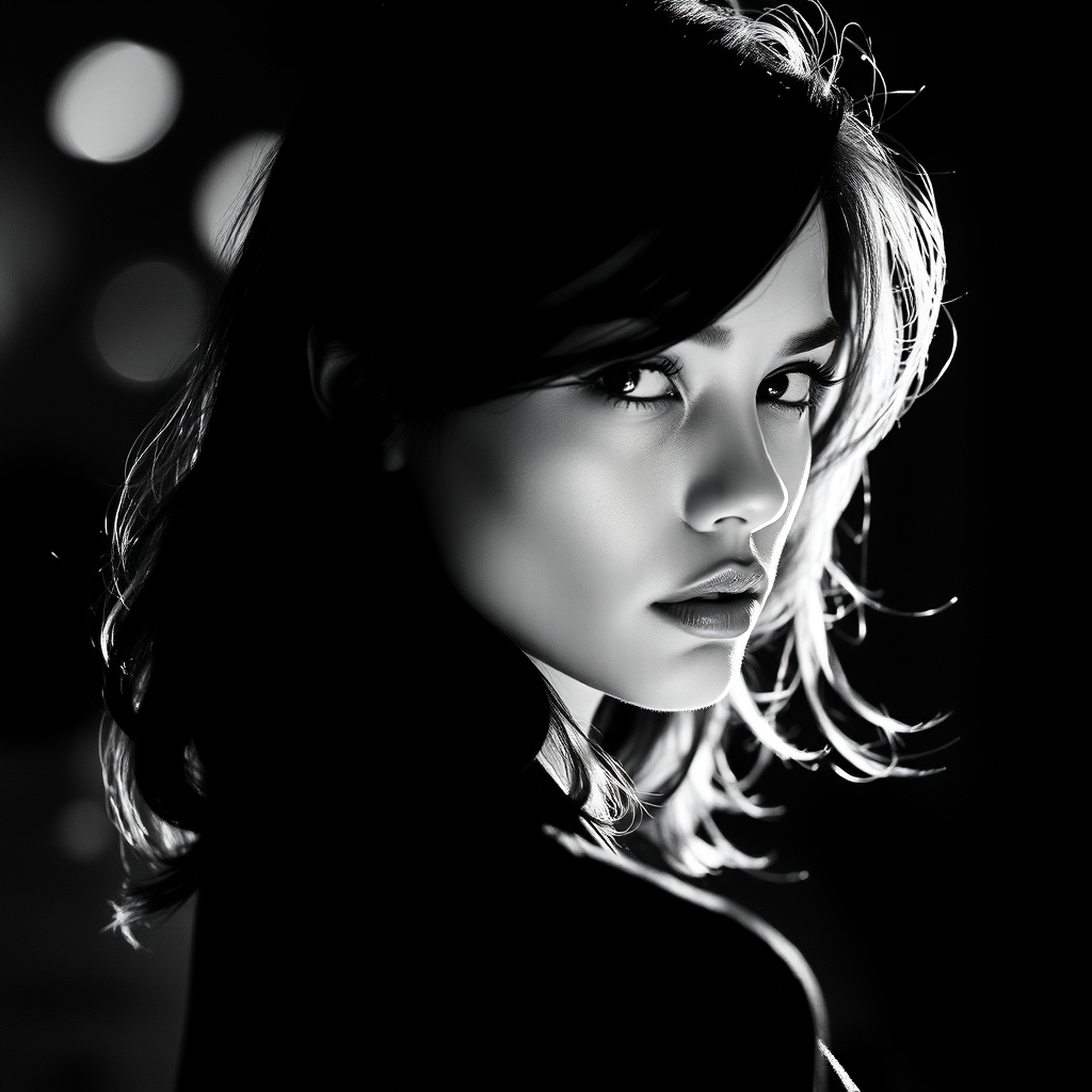 Monochrome photography capturing the essence of Bruce Davidson's style, featuring a fashion editorial with a dark-haired woman. Shot using long exposure techniques through an artistic lens, the image is a high-resolution, realistic portrayal. Professional-grade photography showcases a cinematic angle with dynamic backlighting, complemented by an exquisite bokeh effect.