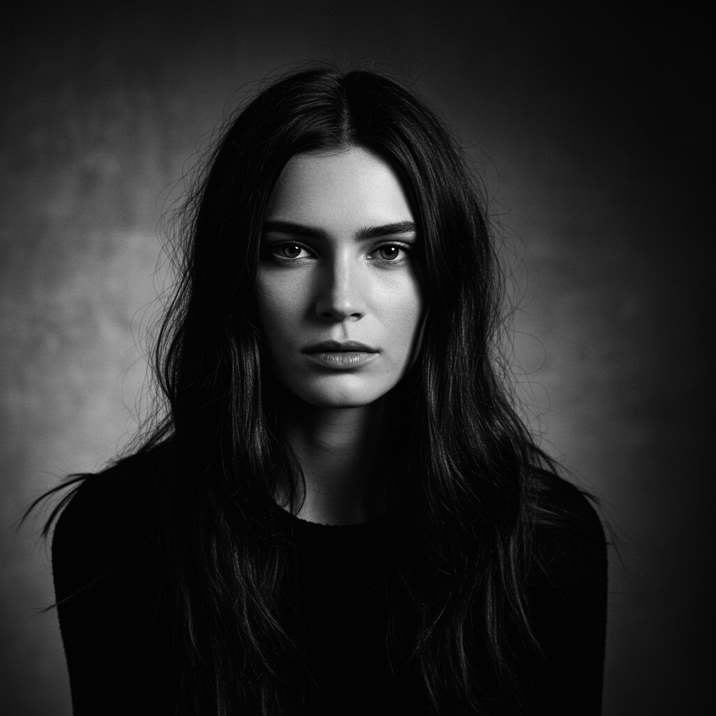 Monochrome photography inspired by Bruce Davidson, featuring a fashion editorial shoot with a dark-haired woman captured using long exposure techniques through an artistic lens. High-resolution and realistic, this professional photograph is taken from a cinematic angle where dynamic backlighting and bokeh enhance the scene.