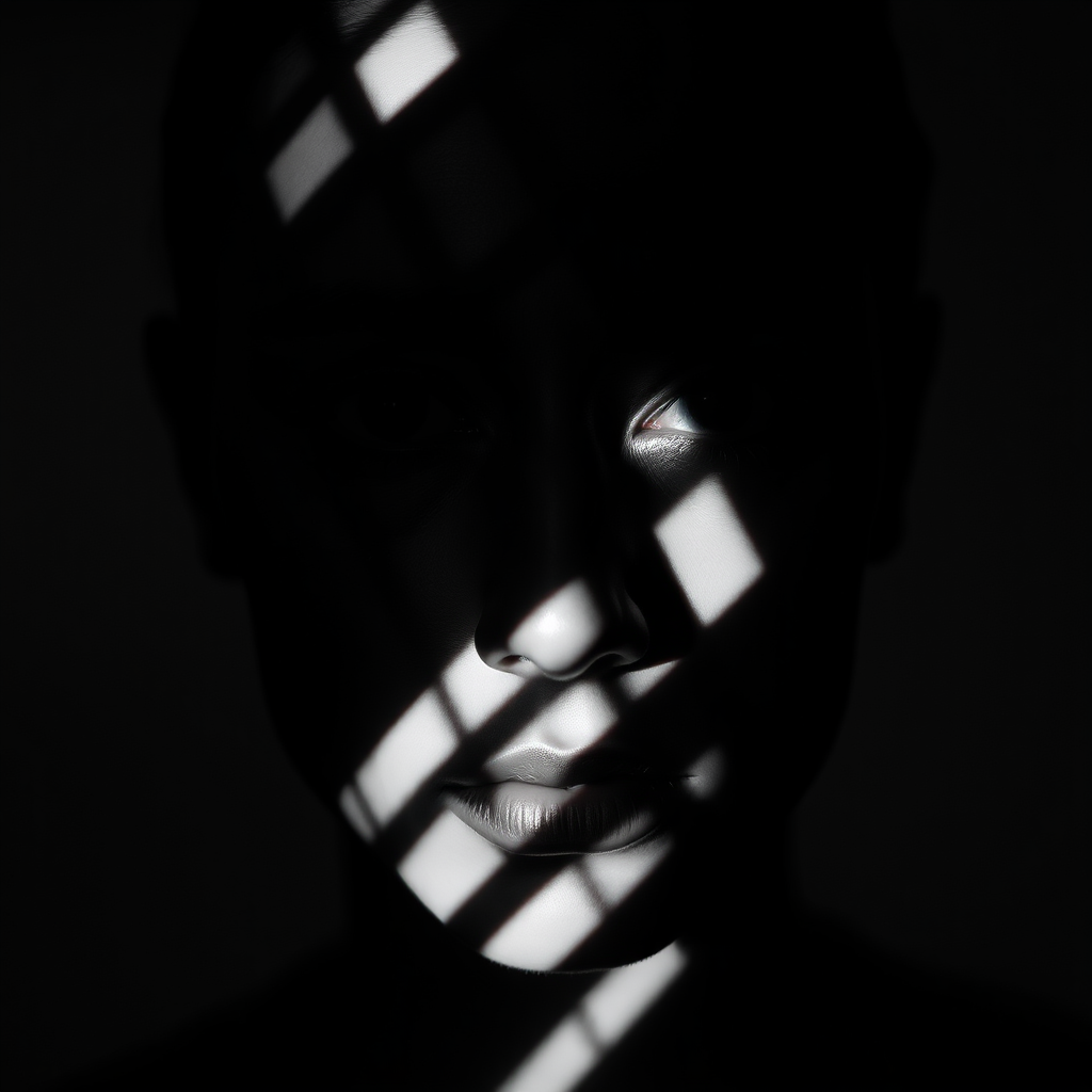 Monochrome portrait capturing a face composed of intersecting light stripes, emphasizing minimalistic graphic design, with a striking play of shadows and highlights giving depth and movement to the structured lines.