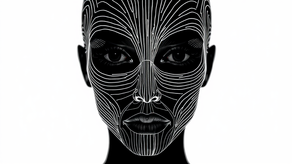 Monochrome portrait capturing a face formed by intricate lines; the head appears crafted from luminous stripes, embodying a minimalist graphic design style, emphasizing light and shadow contrasts in its features.