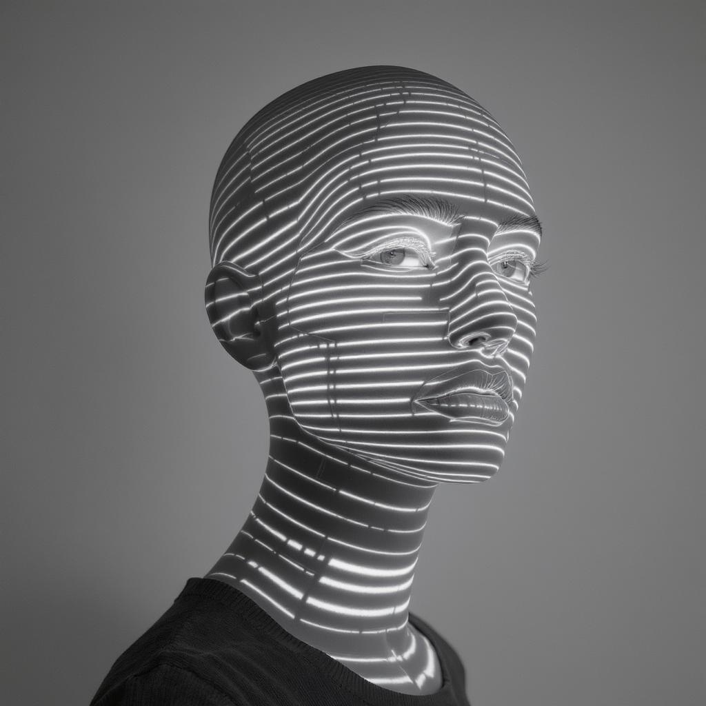 Monochrome portrait of a face composed of intersecting lines, where the head is sculpted from illuminated stripes in a minimalistic and graphic design style, evoking a sense of depth and abstraction through the play of light and shadow.
