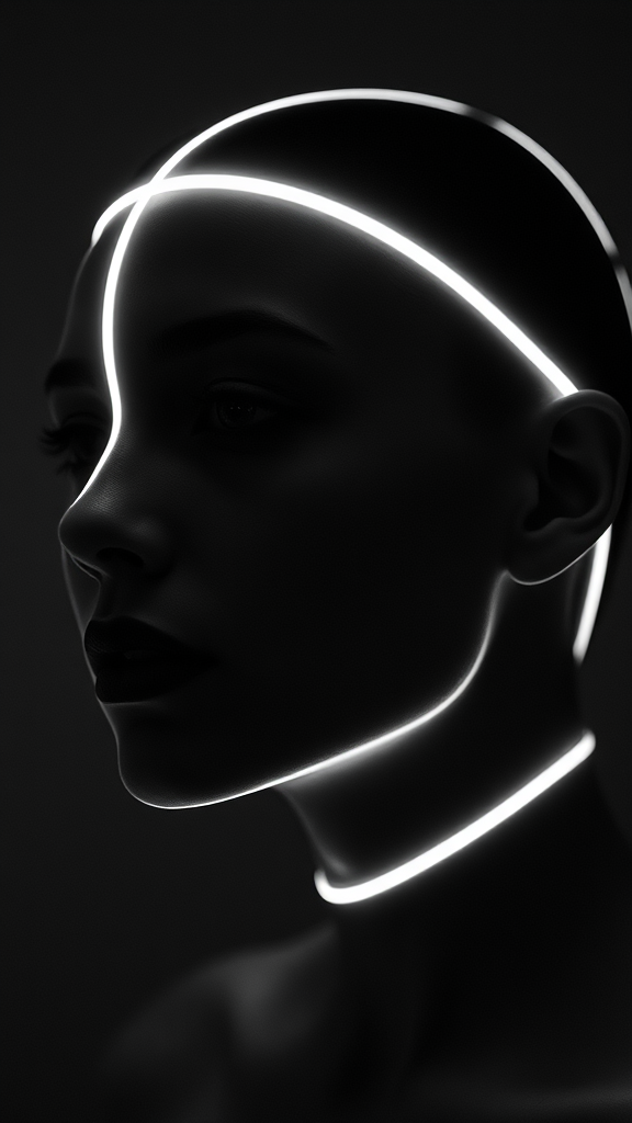 Monochrome portrait of a face illuminated by bands of light, the head composed of sleek light stripes in a minimalistic and graphic design aesthetic, capturing a striking interplay of shadow and illumination.