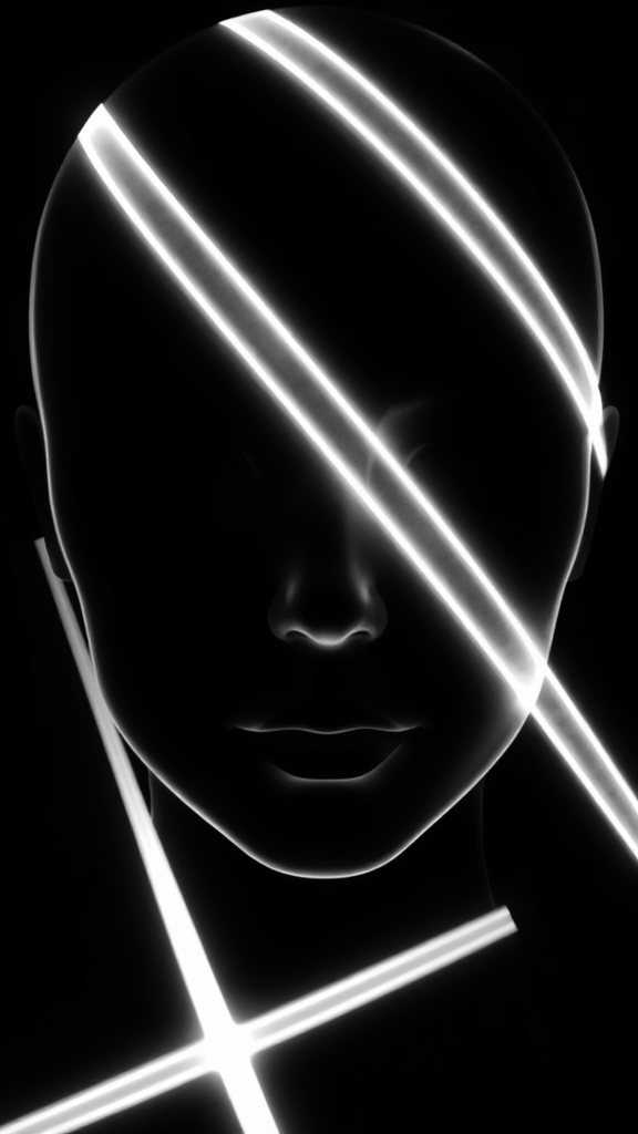 Monochrome portrait of a face, illuminated with intersecting beams of light, arranged in a pattern of lines. The contours of the head are formed by sleek, luminous stripes, embodying a minimalistic and graphical aesthetic.