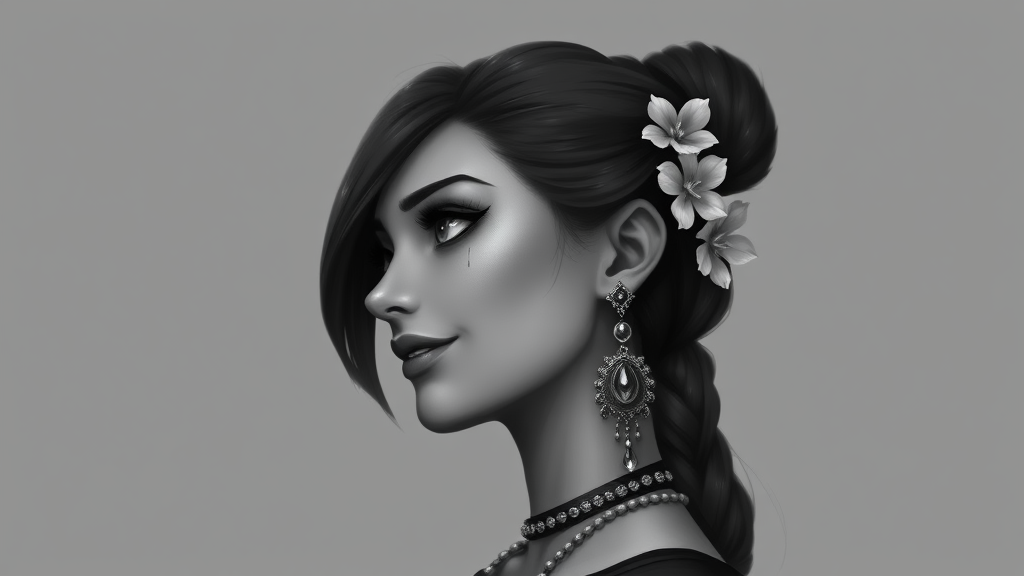 Monochrome portrait of a single female character inspired by Dota 2's Dark Willow, featuring a grey background with a subtle spot color on her facial mark and earrings. Her parted lips and visible teeth suggest a light, enigmatic smile as she glances to the side in a profile view. Her nose is delicate, adding to the realistic depiction. She wears intricate jewelry, including earrings that accentuate her ethereal elegance. A small flower is tucked behind her ear, adding a touch of whimsy to her look.