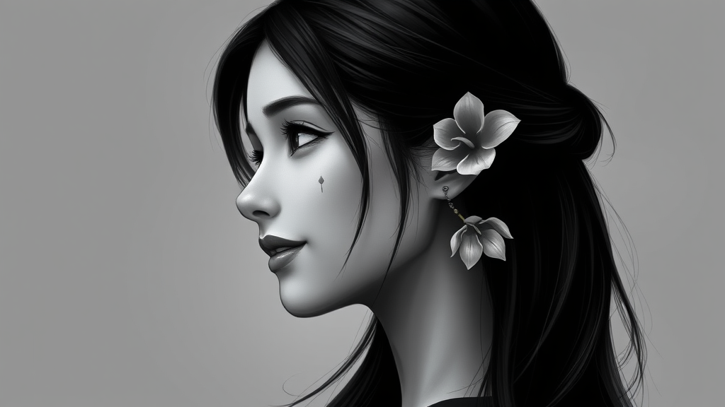 Monochrome portrait of a young woman with parted lips and a subtle, light smile, gazing thoughtfully to the side against a grey background. Her profile displays a distinctive facial mark and elegant earrings, adding a touch of jewelry to her look. Her nose and teeth are delicately defined, enhancing the realistic portrayal. A single spot of color highlights a flower tucked behind her ear, reminiscent of the mysterious and enchanting aura of Dota 2's Dark Willow. Her hair cascades gracefully as she stands solo, drawing inspiration from a darker fantasy theme while maintaining a discernible, softened expression.