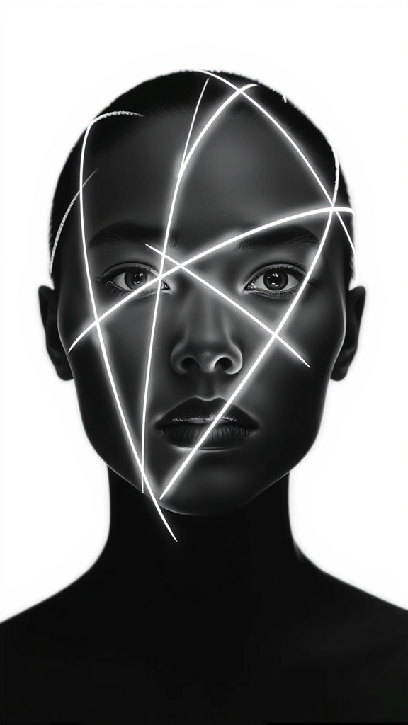 Monochrome portrait photography featuring a face composed of intersecting lines. The head is crafted from beams of light, emphasizing a minimalistic and graphic design approach. Stripes of illumination contour the visage, creating a striking and abstract representation that blends simplicity with artistic complexity.