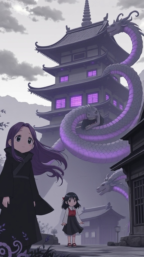 Monochrome scene featuring characters from Spirited Away, accented with subtle touches of purple; Chihiro's flowing hair catches the breeze, her eyes wide with wonder; No-Face stands nearby, shrouded in shadows yet adorned with a purple-hued aura; the towering bathhouse looms in the background, its traditional architecture laced with hints of lavender light; Haku, in dragon form, coils gracefully through the air, scales glimmering with violet undercurrents; the spirit world comes alive in this gray-scale dusk, where every flash of purple adds mystery and enchantment.