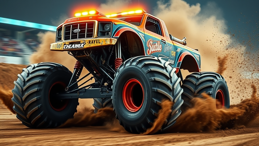 Monster truck barreling towards the camera, capturing the dynamic motion and intense energy of the sports scene, showcasing the vehicle's power and agility with vibrant colors and high dynamic range that highlights every detail, dirt flying as the massive tires grip the terrain, creating a thrilling and immersive photographic moment.