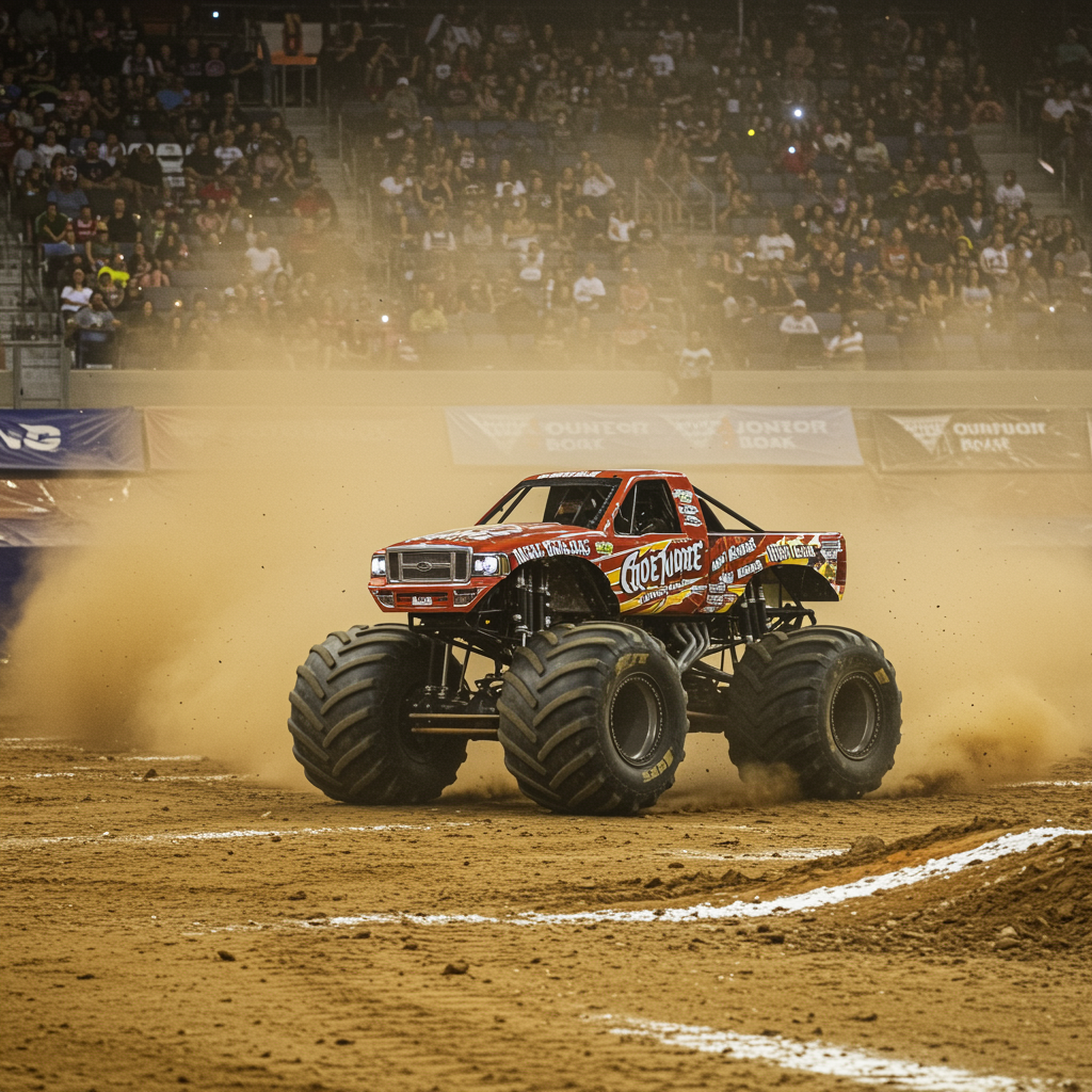 Monster truck racing through a dusty arena, capturing the adrenaline-fueled action with high-speed sports photography, showcasing the immense power of the vehicle as it barrels towards the camera, finely balancing dynamic range to highlight the intricate details of the truck amidst flying debris and intense motion, freezing the captivating moment of roaring engines and sheer velocity.