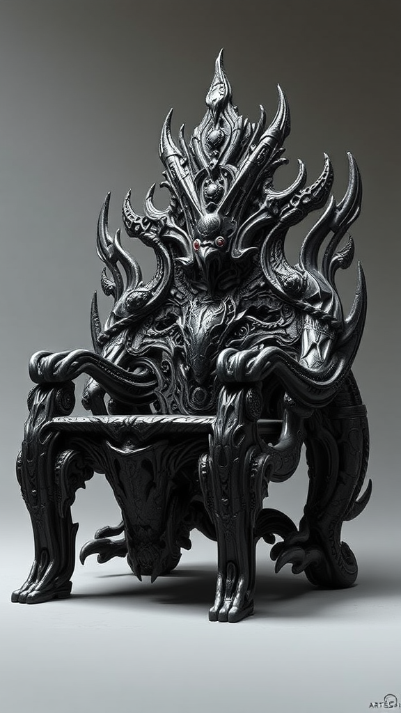 Monumental HR Giger-inspired chair, avant-garde concept furniture, intricately detailed with biomechanical elements, painted in rich greys, hyper-realistic illustration, digital artwork trending on artstation, showcasing fine and intricate details, viewed from a dynamic diagonal angle, subtly infused with organic textures and surreal elements to heighten the otherworldly atmosphere.