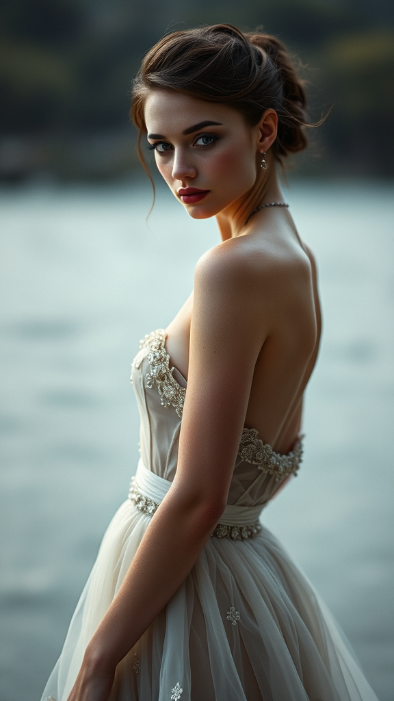 Mood: tranquil; atmosphere calm; fashion photography; Annie Leibovitz; Female Model portrait; couture gown; ethereal silhouettes; intricate skin texture; captivating eyes; remarkable physique --ar 4:6 --chaos 6 --s 1000 --q 5 --s 700 --v 5