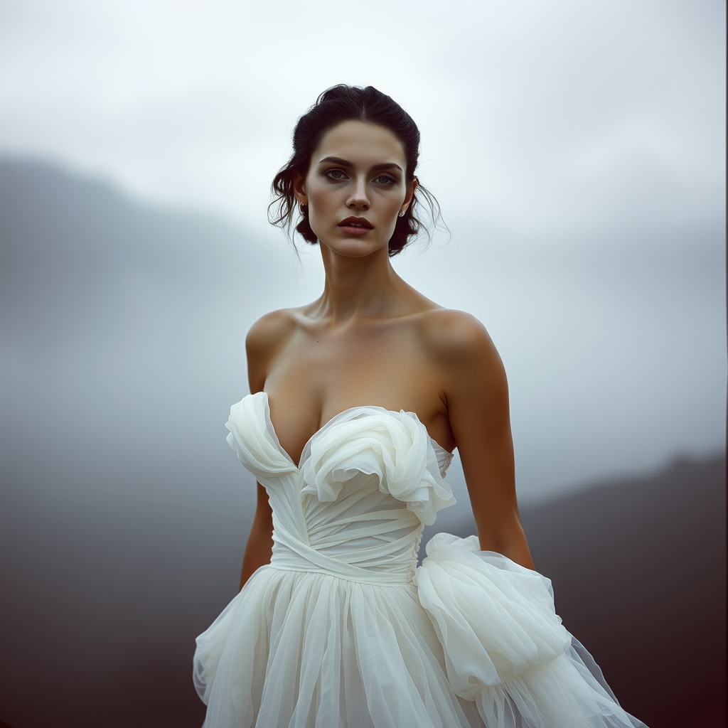 Mood: tranquility; atmosphere calm; fashion imagery; Herb Ritts; female model head to toe; couture gown; ethereal silhouettes; intricate skin details; captivating eyes; exceptional body form --aspect ratio 4:6 --randomness 7 --sharpness 1000 --quality 5 --quality 2 --sharpness 750 --version 5