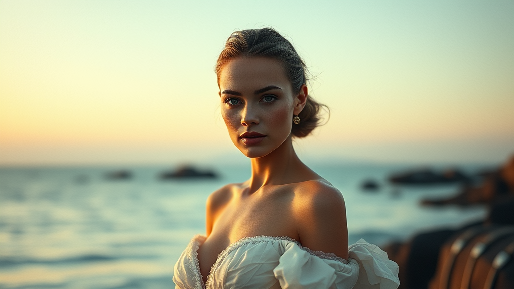 Mood: tranquility; atmosphere calm; fashion imagery; inspired by Mario Testino; female model portrait; elegant gown; ethereal silhouettes; intricate skin texture; captivating eyes; exceptional physique; --ar 3:4 --chaos 6 --s 900 --q 4 --s 700 --v 5