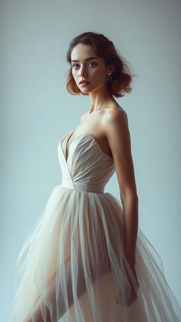 Mood: tranquility; atmosphere calm; fashion photography; reminiscent of Mario Testino; female model in full body shot; elegant couture dress; airy silhouettes; intricate skin details; captivating eyes; striking body composition; aspect ratio 4:6; subtle unpredictability; high stylization; quality emphasis on proportion and detail; version 5.