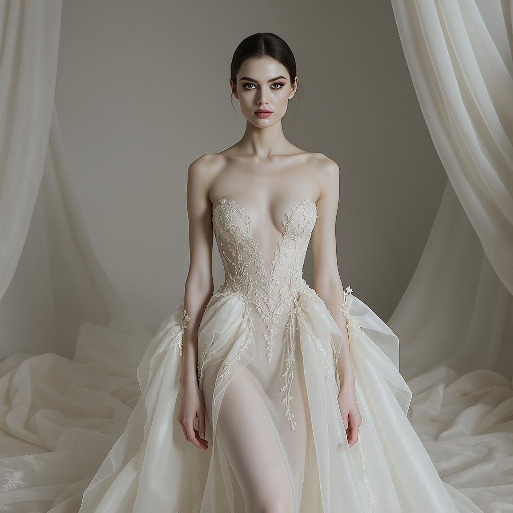Mood: tranquility; atmosphere calm; fashion photoshoot; inspired by Mario Testino; female model, full body; couture gown; ethereal silhouettes; intricate skin details; captivating eyes; stunning body architecture -- aspect ratio 2:3 -- style intensity 750.