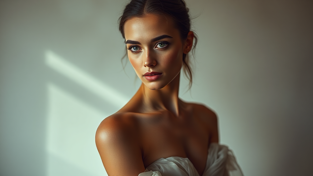 Mood: tranquility; atmosphere calm; fashion portrait; inspired by Mario Testino; elegant female model; design gown; ethereal forms; intricate skin details; captivating eyes; stunning body proportions; aspect ratio 4:6; creative unpredictability; sharpness emphasized; high quality; vivid expression.