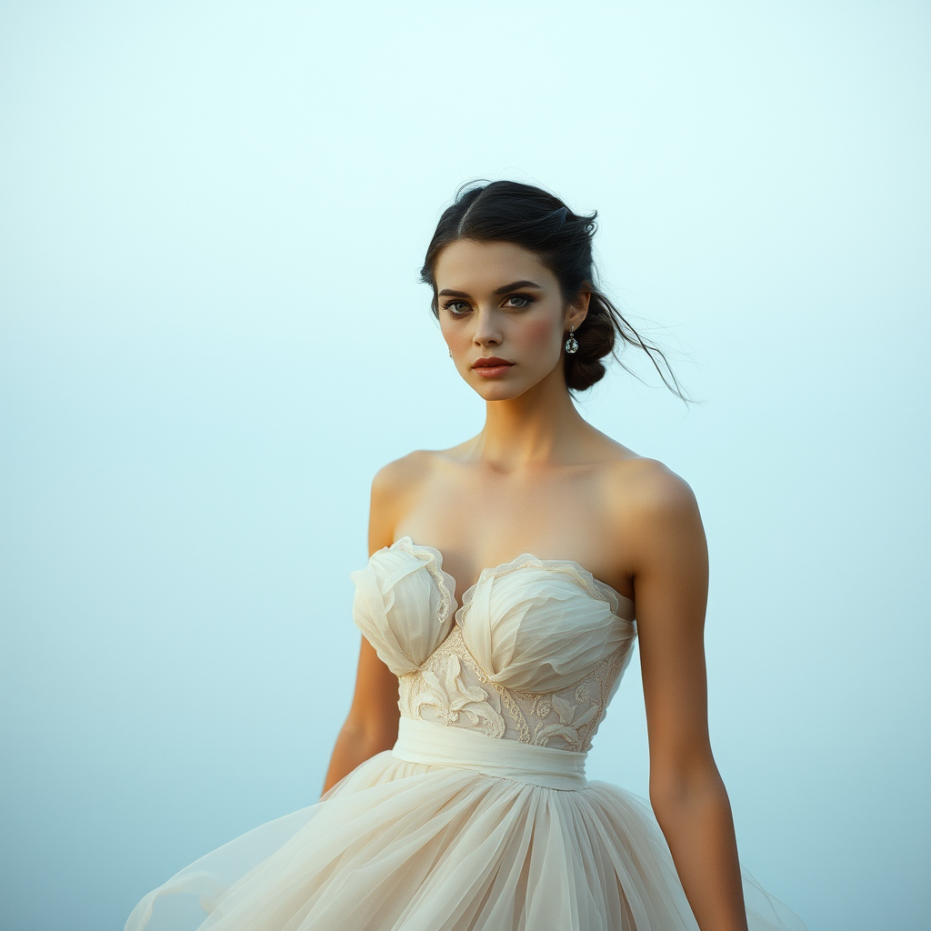 Mood: tranquility; atmosphere calming; fashion photography; inspired by Mario Testino; female model full figure; couture dress; ethereal silhouettes; intricate skin detail; captivating eyes; stunning body structure; aspect ratio 4:6; hint of fantasy; graceful movement; artistic flair; serene elegance; sophisticated style