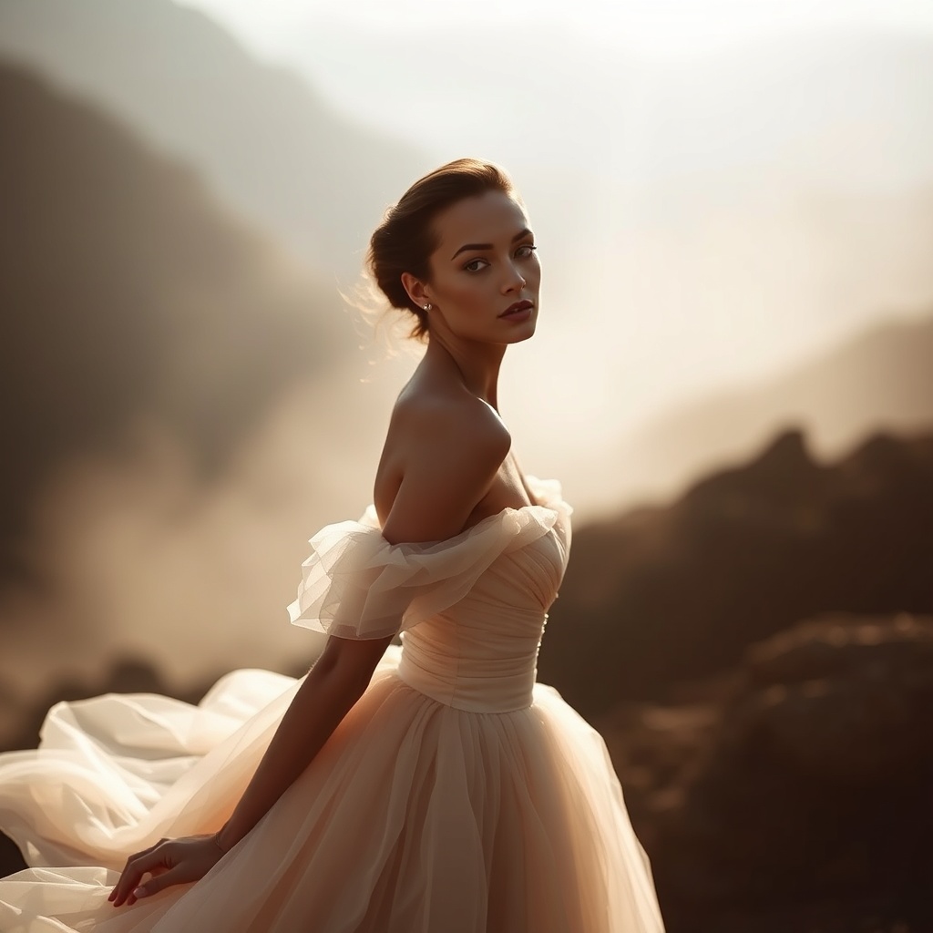 Mood: tranquility; atmosphere calm; fashion photography; inspired by Mario Testino; female model posed gracefully; elegant gown; ethereal silhouettes; radiant skin; captivating gaze; exquisite body composition; aspect ratio 4:6; creative variance 7; stylization 1000; quality emphasis 5; cohesion 750; version 5.
