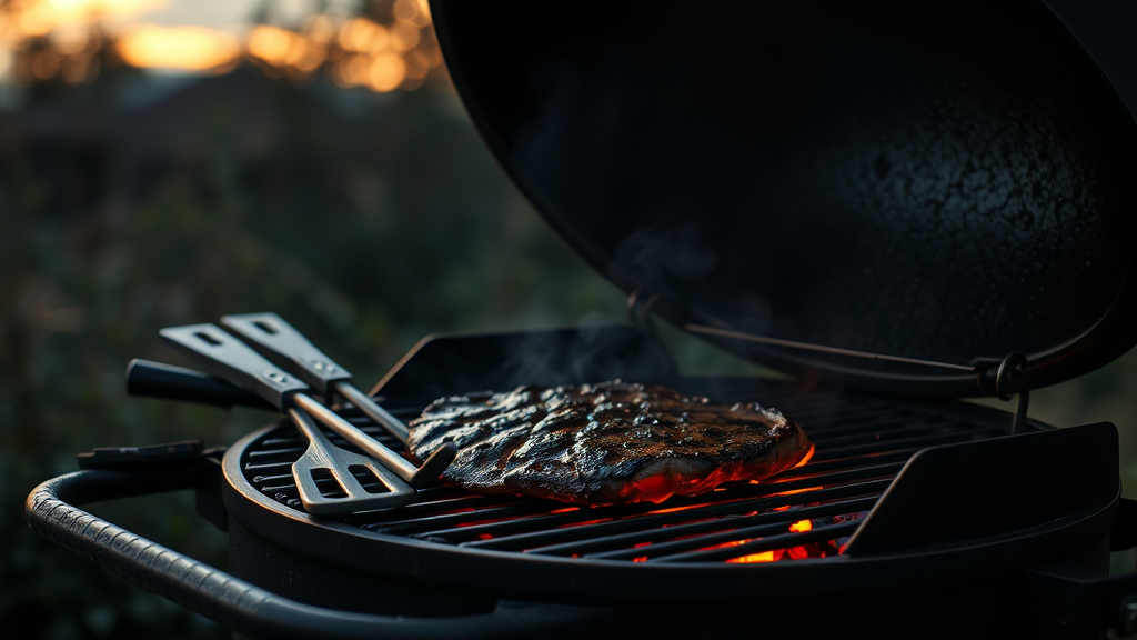 Moody shot of a vintage barbecue grill with well-used, glistening grill tools resting on it, a perfectly charred piece of marinated meat sizzling over glowing coals, set against a backdrop of softly blurred, shadowy garden foliage under an overcast twilight sky.