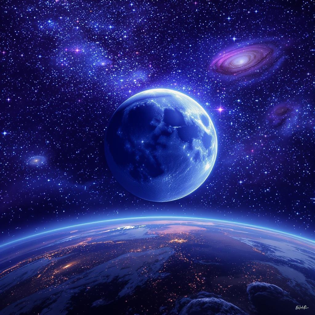 View this AI-generated image featuring a massive moon descends dramatically towards the earth surrounded by an intricate tapestry of vibrant galaxies the scene is bathed in a mesmerizing blend of blues and purples creating a vivid and surreal cosmic spectacle the atmosphere feels otherworldly with a