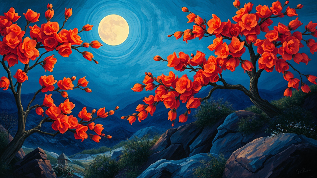 Moonlight blossoms illuminate a dynamic landscape, painted in the vibrant hues of Bay Area Figurative Art. A striking interplay of orange and deep crimson dances across realist figures, set against a fluid backdrop reminiscent of Whistlerian and Phoenician influences. The composition weaves landscapes in motion with rich tapestries of blue, capturing the rhythmic essence of nature.
