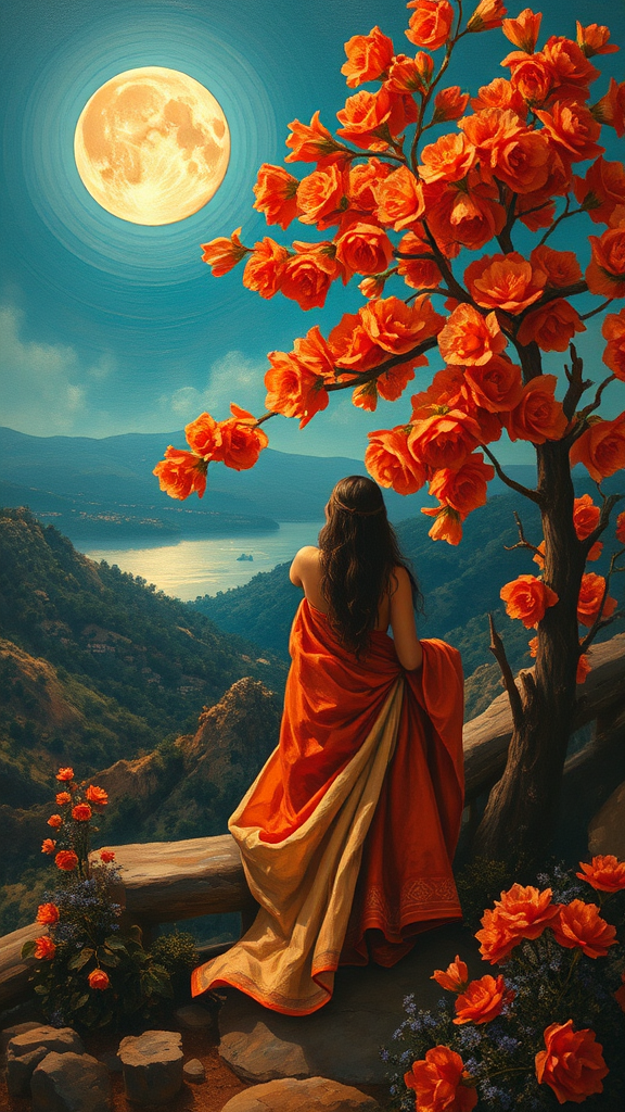 Moonlit bloom casting a gentle hue, a painting merging the essence of Bay Area figurative art with a splash of vibrant orange, showcasing realist figures amidst dynamic landscapes. Whistlerian influences entwine with ancient Phoenician motifs, weaving threads of crimson and blue in a harmonious dance.