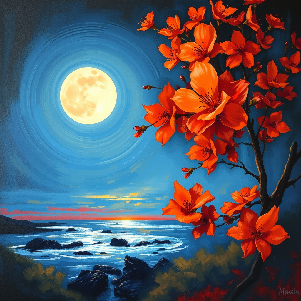 Moonlit bloom casts its gentle glow, a painting capturing the essence of Bay Area figurative art, where hues of orange mingle with realist figures. Landscapes dance with kinetic energy, reminiscent of Whistlerian tones intertwined with Phoenician artistry. Crimson and blue brushstrokes weave through the scene, crafting a harmonious balance, embodying both movement and stillness.