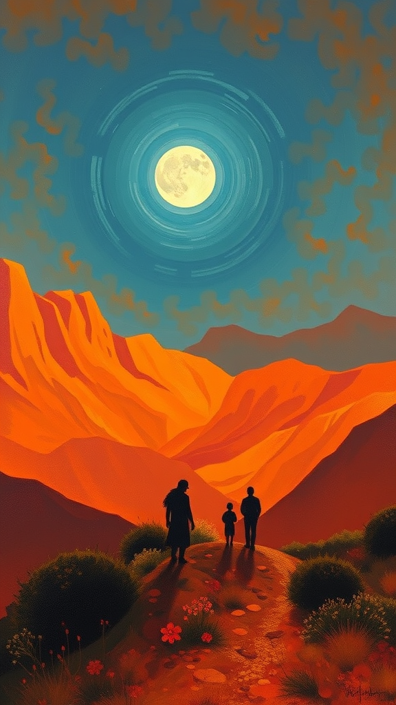 moonlit bloom, painting, bay area figurative style, warm orange hues, realistic figures, dynamic landscapes, whistlerian influences, echoes of phoenician art, touches of crimson and blue, aspect ratio 37:43, stylized essence version 6