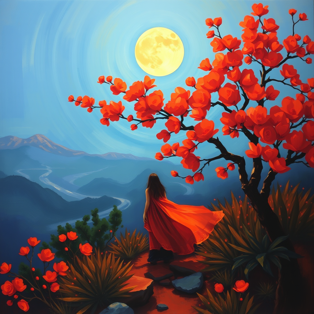 Moonlit blossoming scene, a painting that captures the essence of bay area figurative art, infused with vibrant orange hues. A realist figure stands amidst landscapes that seem to dance with motion, reminiscent of a Whistlerian touch. The artwork hints at Phoenician influences, with a rich palette of crimson and blue, creating a harmonious yet dynamic visual narrative.