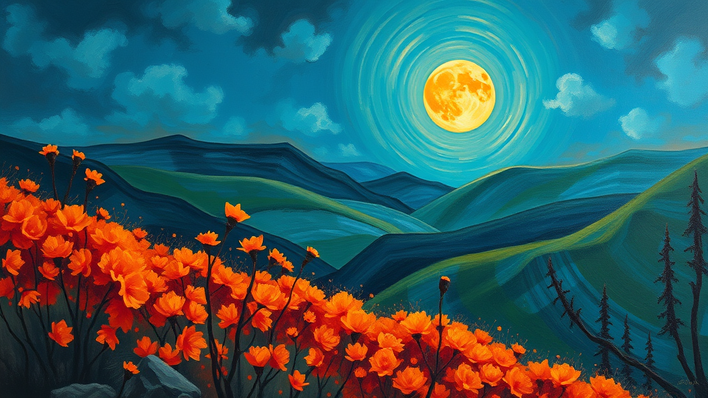moonlit landscape in bloom, painting, bay area figurative style, vibrant orange hues, realistic figures, dynamic landscapes, echoes of whistlerian influence, touches of phoenician artistry, rich crimson and blue tones, capturing the serene motion of nature