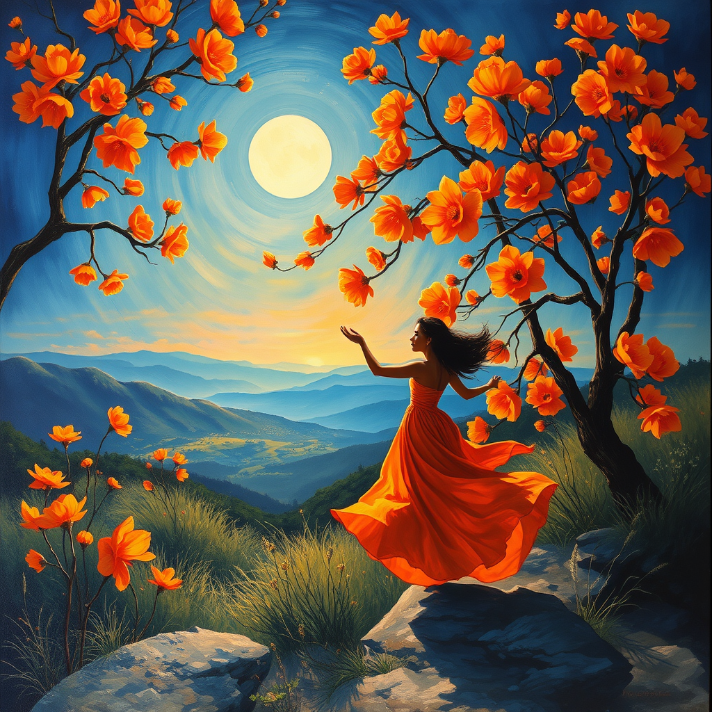 Moonlit scene bursting into bloom, a painting blending Bay Area Figurative Art with vibrant orange hues, a realistic figure caught amidst landscapes in gentle motion, evoking Whistlerian and Phoenician influences with hints of crimson and blue, capturing a dance of colors in an elongated frame.