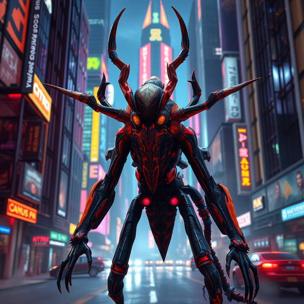 Mortal Kombat character D'Vorah as an insectoid warrior set in a vibrant cyberpunk cityscape, featuring neon-lit streets and towering skyscrapers; crafted in hyperrealistic, photorealistic detail, with an 8k resolution and rendered using an advanced 3D engine, capturing the intricate, expressive textures of her exoskeleton and cybernetic enhancements, emphasized by dramatic urban lighting and smoky atmospheric effects, as if brought to life in an ultra-realistic animated experience.
